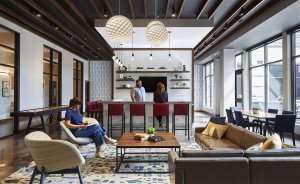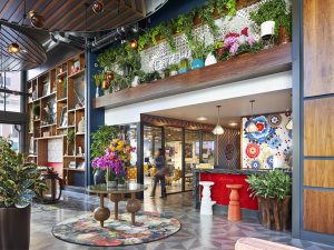 “…a more is more ethos is evident with the spirited lobby design draws upon visually rich layers of color, pattern, and texture…”