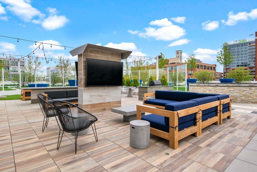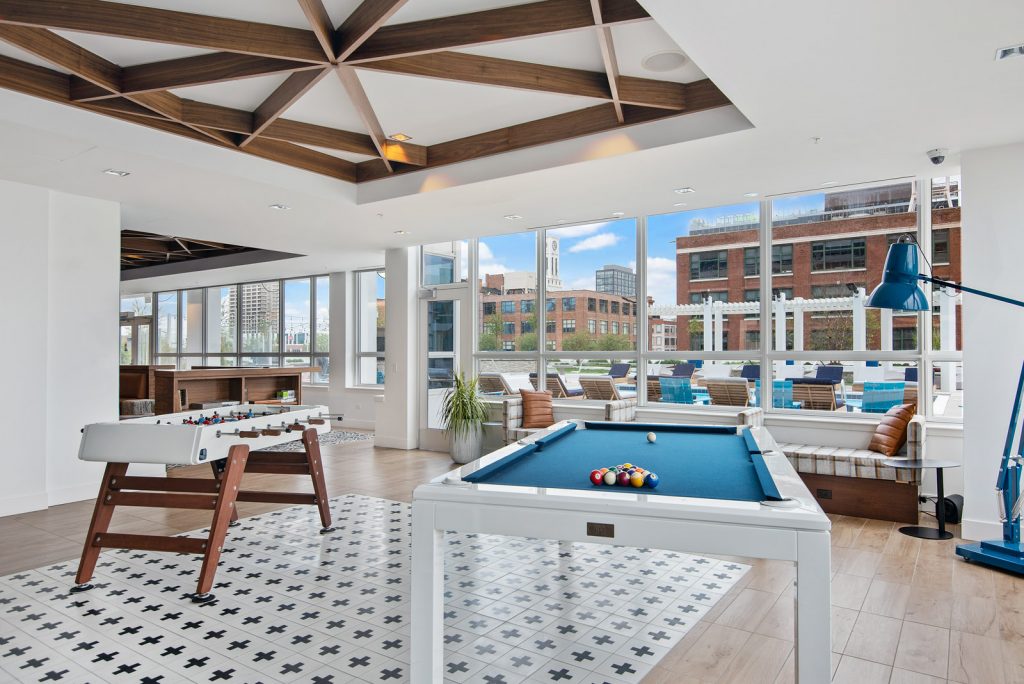 Throughout the fifth-floor amenity spaces, a warm wood-tone floor is contrasted with graphic elements and accents of color. In the party room, a floral rug and rich walnut wood tones are juxtaposed with graphic black and white concrete tiles on both the floor and wall that will endure a beautiful patina over time. This same black and white floor tile is a repeating element in the game room where residents can enjoy a variety of games including billiards, board games, and a giant wall Scrabble game. A colorful, abstract watercolor graphic draws residents to the fireplace lounge and out to the newly outfitted roof deck.
