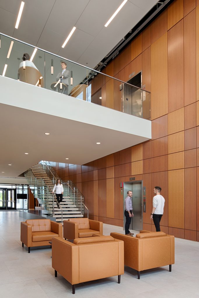 The building’s design responds to its urban and natural surroundings with a palate of materials that are both elemental and durable. Stone, brick, metal, wood, and glass create forms that emerge solid and straight – defining the building volumes on the site’s north and west boundaries. These forms are positioned to engage with the public water feature and provide views of the wooded landscape beyond to the south and east.