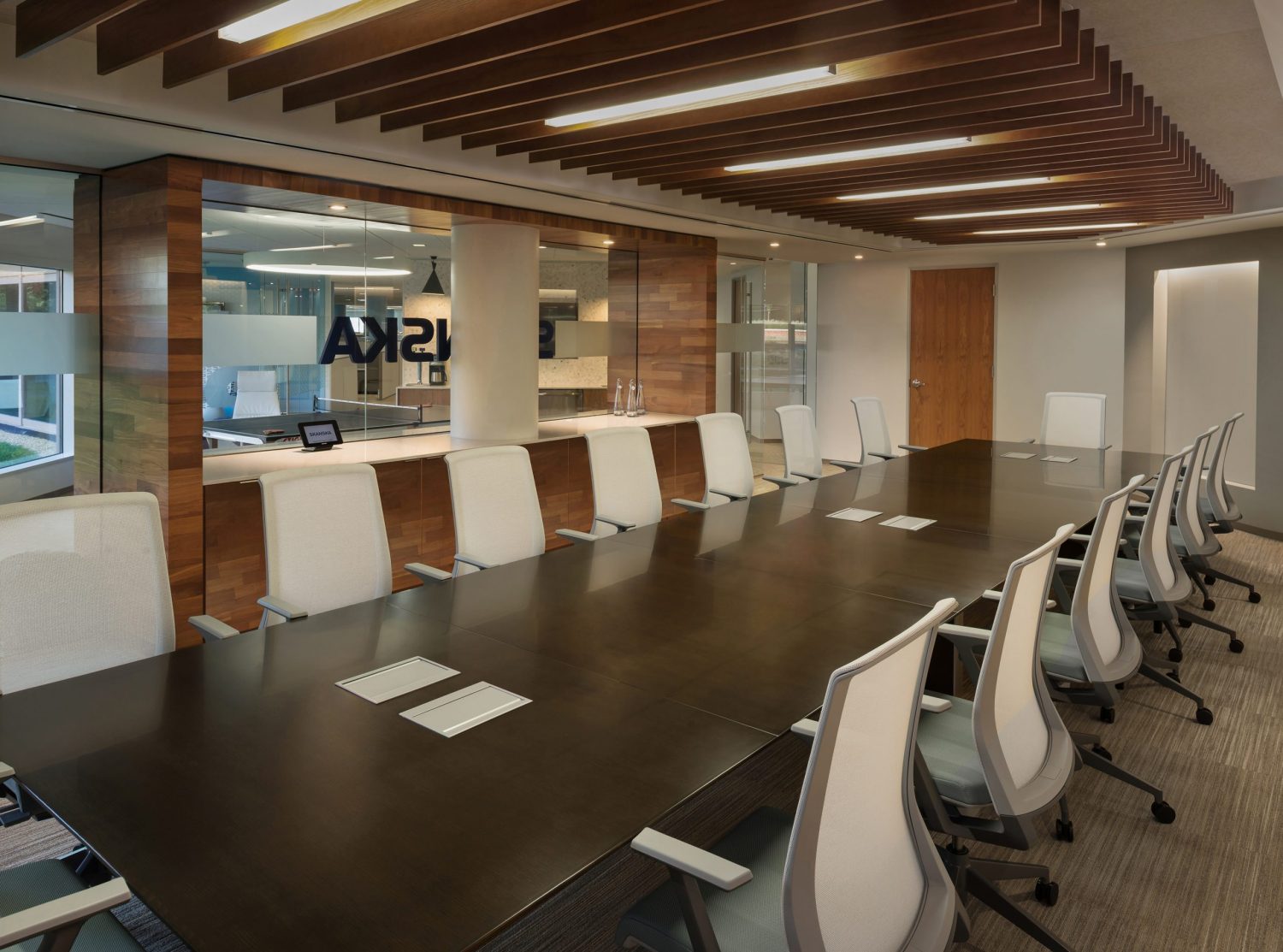 This resulted in the creation of a wood feature wall inscribed with the corporate logo. This recessed āSā reflects the subtle yet significant concepts associated with Skanska.